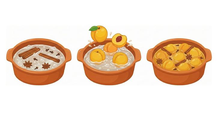 Agreguen los duraznos y cocinen a fuego lento por 30 a 40 minutos, hasta que el almíbar esté espeso y brillante.