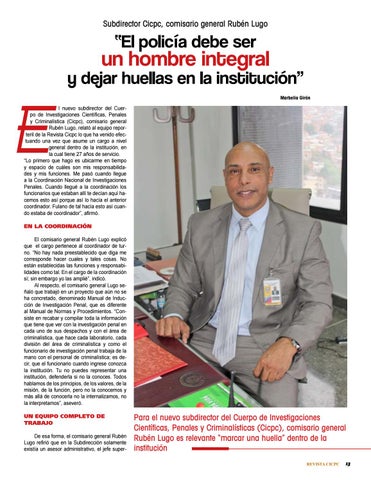 l nuevo subdirector del Cuerpo de Investigaciones Científicas, Penales y Criminalística (Cicpc), comisario general Rubén Lugo, relató al equipo reporteril de la Revista Cicpc lo que ha venido efectuando una vez que asume un cargo a nivel general dentro de la institución, en la cual tiene 27 años de servicio. “Lo primero que hago es ubicarme en tiempo y espacio de cuáles son mis responsabilidades y mis funciones. Me pasó cuando llegue a la Coordinación Nacional de Investigaciones Penales. Cuando llegué a la coordinación los funcionarios que estaban allí te decían aquí hacemos esto así porque así lo hacía el anterior coordinador. Fulano de tal hacía esto así cuando estaba de coordinador”, afirmó. EN LA COORDINACIÓN