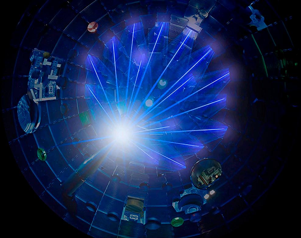 Los 192 rayos láser de alta energía de NIF convergen en el centro de la cámara objetivo para implosionar una pequeña pastilla de combustible de hidrógeno y provocar una reacción de fusión termonuclear.
