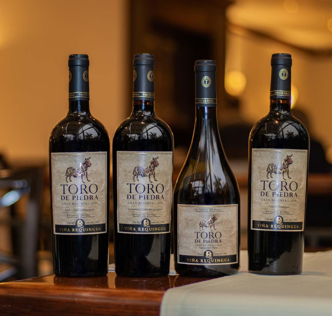 La bodega presenta 35 variedades de uva y 7 líneas de vinos, pero solo cuatro bajo la marca Toro de Piedra. El nivel Reserva es del Valle Central, lo que significa que hay distintos puntos de origen. Son vinos que tienen menos concentración en roble para el público más joven y quienes empiezan a consumir vino. Continuamos con Gran Reserva, la cual acoge 13 diferentes vinos que provienen de un viñedo específico, arriba está el Super Premium (Rincón de los Vientos) con dos presentaciones: Cabernet Sauvignon y Carmenere, y terminamos con el nivel Reserva de Familia (Colección Diamante) que tiene cinco vinos: Clarette, Merlot, Pinot Noir, Late Harvest y Muret. Son producciones pequeñas en medio de una línea dinámica y específica. Perfecto para el consumidor que sabe de vinos y busca algo singular.