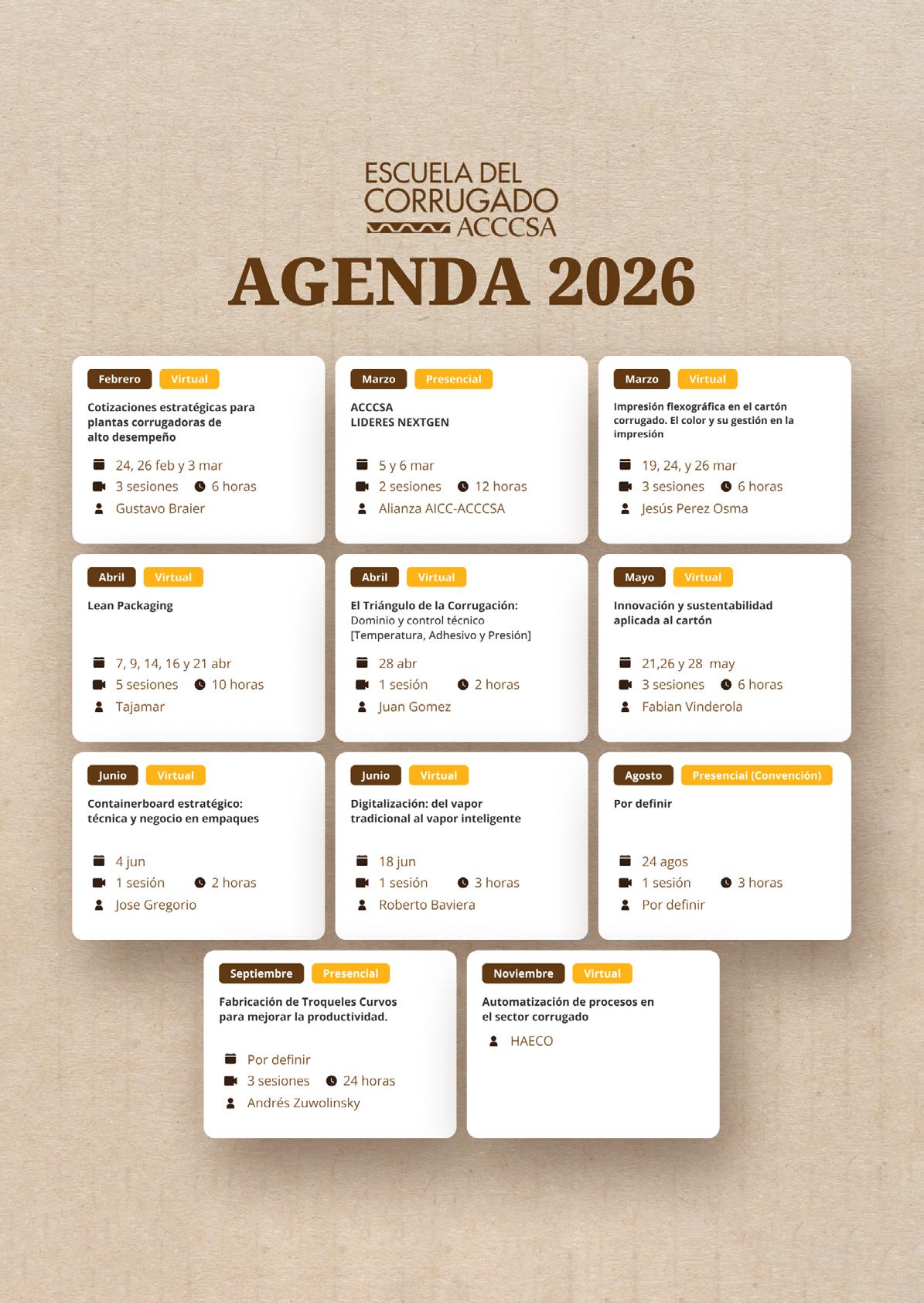 Con la agenda 2026 ya disponible, ACCCSA invita a sus asociados a planificar sus capacitaciones y aprovechar este beneficio exclusivo de membresía. La Escuela del Corrugado reafirma así su compromiso con la excelencia técnica, la innovación continua y la construcción de una comunidad de aprendizaje colaborativa que impulse el desarrollo sostenible del sector.