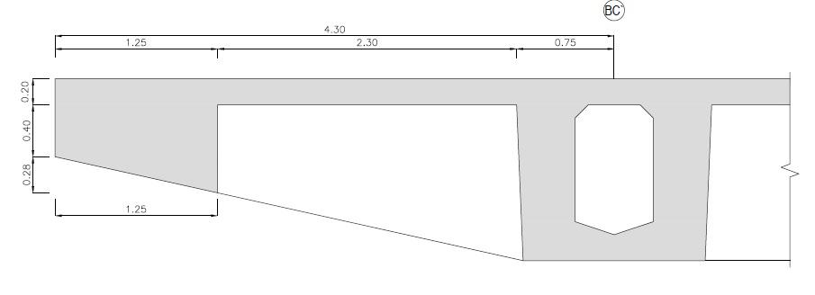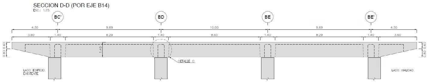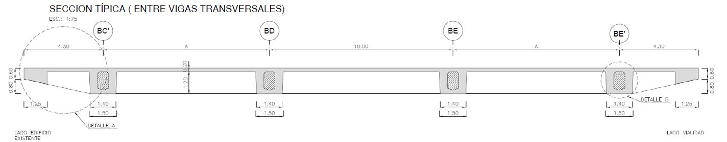 El entrepiso del nivel +6.00 m (piso del Zepelín) se encuentra conformado por una retícula de vigas postesadas, de 1.40 m de canto, con voladizos laterales en ambos extremos de altura variable, desde 1.40 m a 0.60 m en el borde. El mismo, descarga sobre apoyos de neopreno en columnas de 100 x 100.