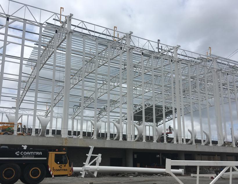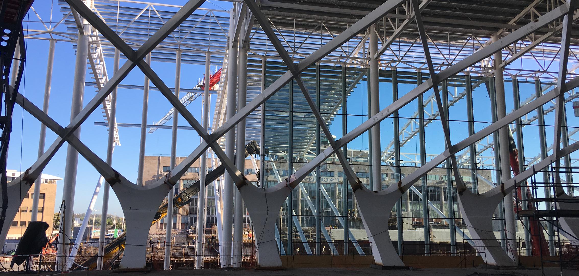 una estructura metálica de 950 toneladas en forma de red, revestida por 2.178 vidrios laminados templados, que permiten el contacto con el exterior y el ingreso de luz natural.