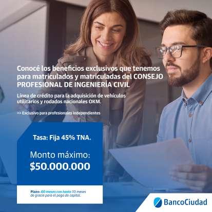 El Banco Ciudad ofrece condiciones preferenciales para los profesionales matriculados en el Consejo Profesional de Ingeniería Civil (CPIC), con una línea de crédito exclusiva para la adquisición de vehículos utilitarios y rodados nacionales 0 km. La tasa fija es del 45% TNA, con un monto máximo