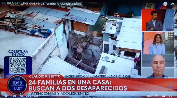 El Ing. Civil Claudio Rissetto (Mat. CPIC Nº 12.086), fue entrevistado por el programa matutino de la Señal Todo Noticias (TN), a fin de brindar precisiones sobre los posibles fallos estructurales responsables del derrumbe de una vivienda en el barrio de Floresta de la CABA.