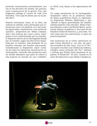 en 2018, muy lejana a las aspiraciones del líder. Un rasgo prominente de la escenografía/ instalación radica en la presencia aérea de falsos superhéroes (Dora, la exploradora; Superman, Batman, Spiderman...), que -allende la figura generalizada del hombre estadounidense como salvador- Albizu Campos adjudica a don Luis Muñoz Marín, quien jurase alianza al gobierno y las leyes de los Estados Unidos de América, y, por ende, “no vale nada para los americanos, ni para los puertorriqueños”. Dos momentos de la noche estremecen la sala Carlos Marichal y, con ella, las paredes invisibles de San Juan. Uno es el “No.” cuyo grito retumba cual resistencia enfática, enérgica como evocación del “No.” solitario e intenso que Rubén Darío plasmara en su poema “A Roosevelt”. El otro, cuando en la parte del discurso en que Albizu Campos sa-