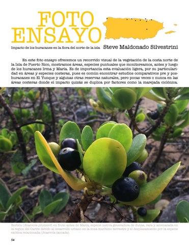 Borbón (Scaevola plumieri) en fruto antes de María, especie nativa generadora de dunas, rara y amenazada en la región del Caribe debido al desarrollo urbano en la zona marítimo terrestre y el desplazamiento por la especie exótica relacionada (Scaevola taccada). 54