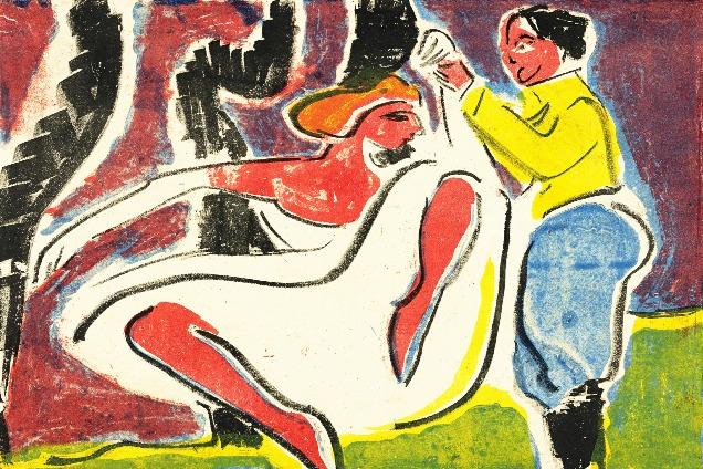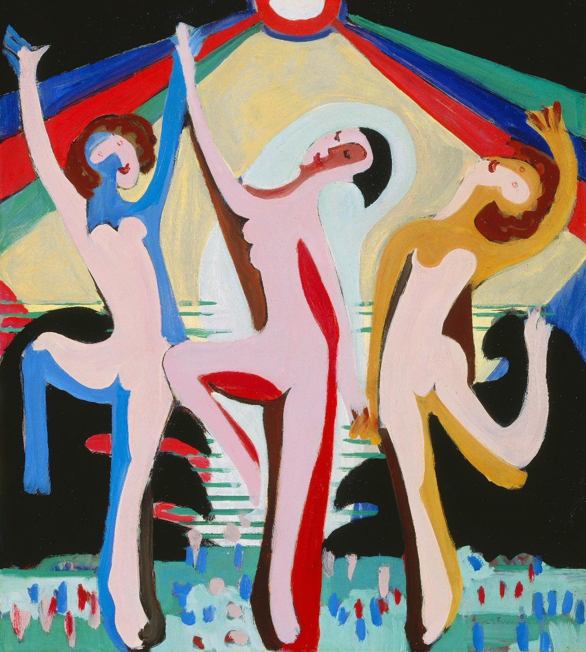 Um dos momentos mais simbólicos de éareunião,pelaprimeiravez,desde1933,das obras e – pinturas monumentais queabriramaretrospectivahistóricadoartista.Exibidas lado a lado, elas condensam a ideia de Kirchner sobre comomonumentalidadeeespaçopodiamdialogarcomo umasócomposição.