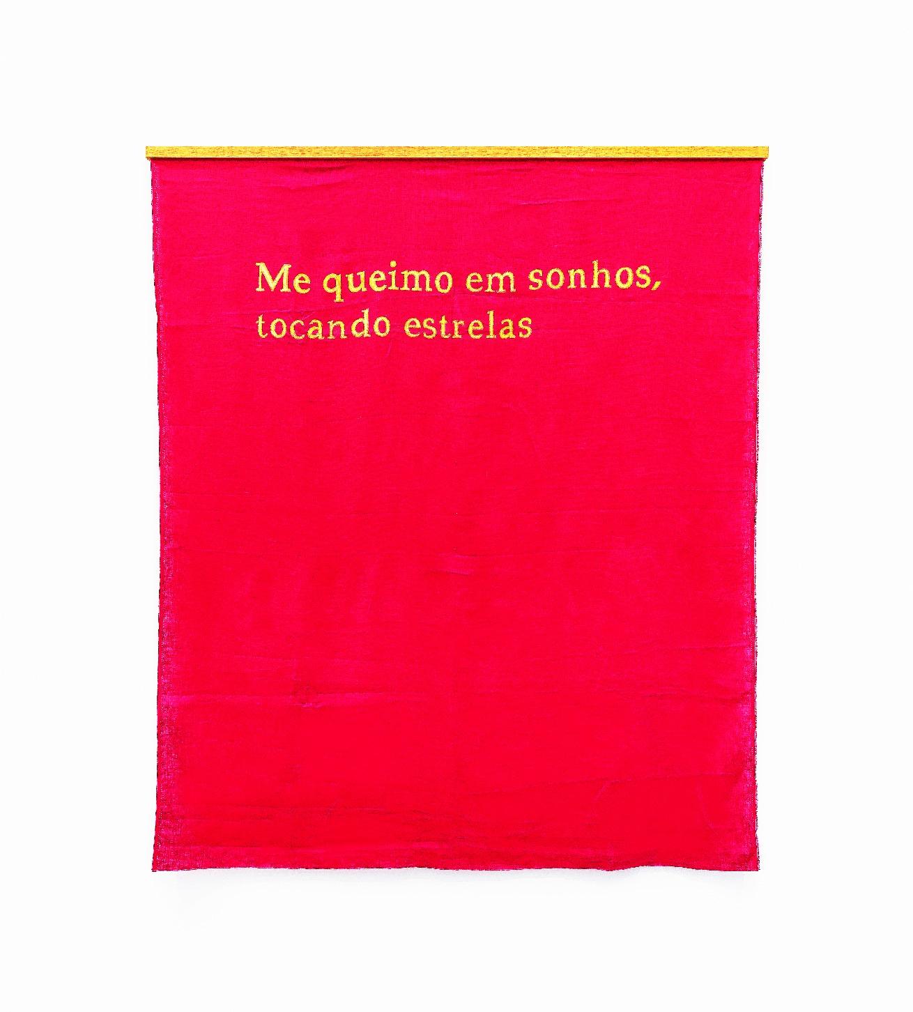 é pintura, e não pintura.Nogestodepintarcadaletra,experimentoo tempo de sua execução, e o que essa ação produz no meu corpo: o cansaço dos dedos e a cor complementar que meu olho vê na parede branca, certotransemeditativo.Mashátambémousodacor pronta e industrial dos tecidos que vibram. Pensar com as mãos, manufaturar os sonhos. Como se, ao pintar, o que escrevo entrasse em mim, e me possuísse. Como se o sonho me encarnasse.”