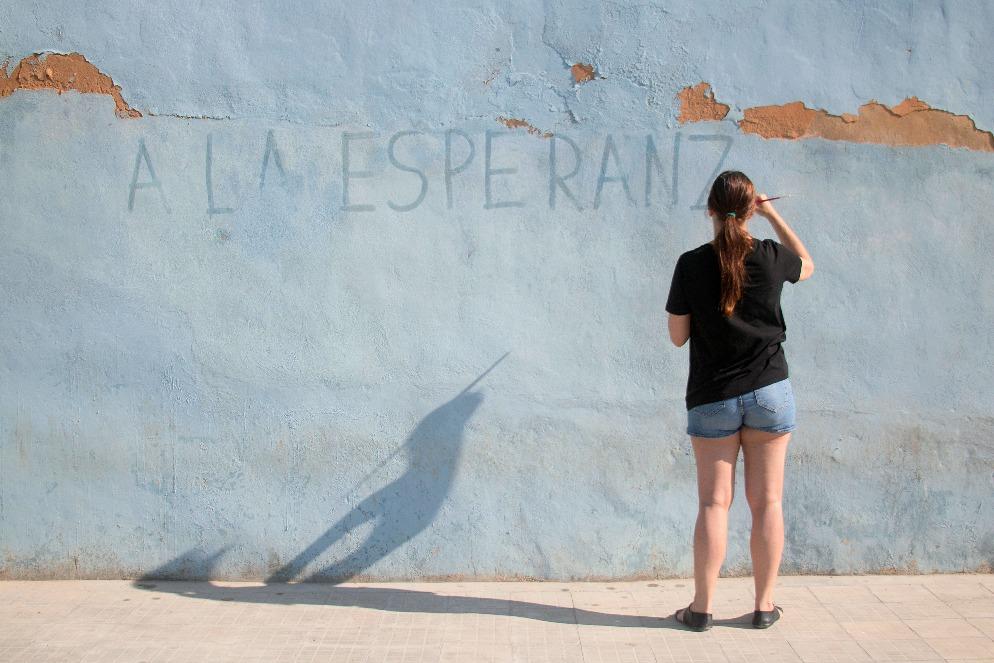 “Fui convidada a participar da XIII Bienal de Havana. Ciente da precariedade econômica do evento, pensei: vou fazer um trabalho que dependa apenas da minha presença. Naquelaedição,partedaBienalaconteciaemMatanzas,cidade famosaporseusmúsicoseescritores.LánasceuCarildaOliver Labra,poetaquealiviveutodaasuavida.Lendoseuspoemas, encontrei um verso que me lembrava um dos ‘lemas’ da Revolução Cubana (Hasta la victoria siempre) e, de alguma maneira, refletia o meu estado de espírito depois de ter passado alguns anos, desde 2015, focada em narrativas jornalísticas e más notícias: ‘A la esperanza vuelvo.’ Como certo contraponto a , apresentei a performance : escreviacomáguaoverso de Carilda sobre uma desgastada parede azulclara, às margens do rio que cruza a cidade. Enquanto o sol apagava as palavras, continuava escrevendo o mesmo verso repetidas vezes, até acabar a água. O esforço contínuo de construção da esperança, quereencontreinapoesia.”