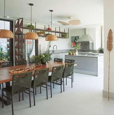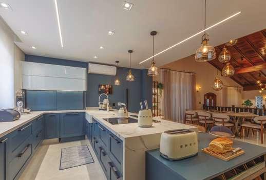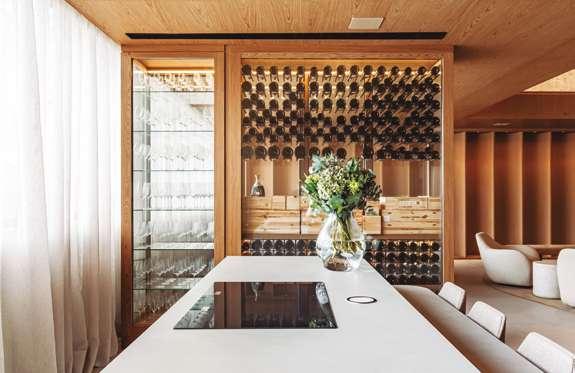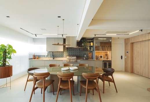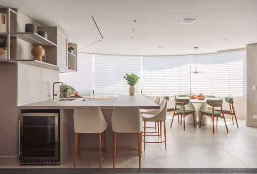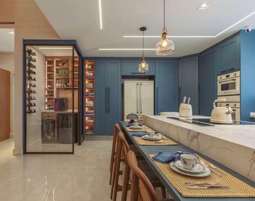 A adega climatizada em madeira e vidro exibe a coleção de vinhos de forma cenográfica, enquanto a cristaleira iluminada organiza taças e copos. A ilha revestida em acabamento branco com cooktop embutido integra funcionalidade e elegância ao espaço