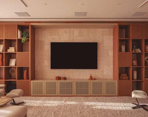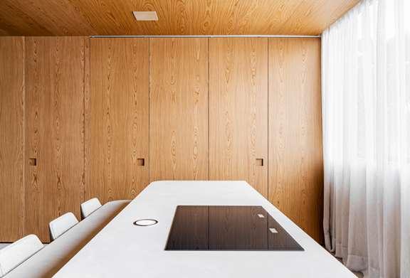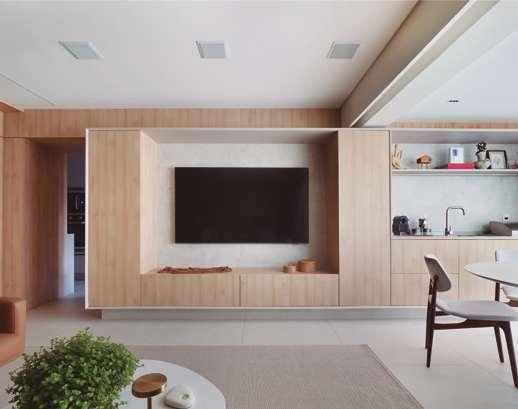A marcenaria em madeira natural com portas de correr e puxadores embutidos cria um volume monolítico e clean, enquanto o teto amadeirado reforça a continuidade material do projeto
