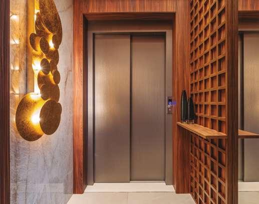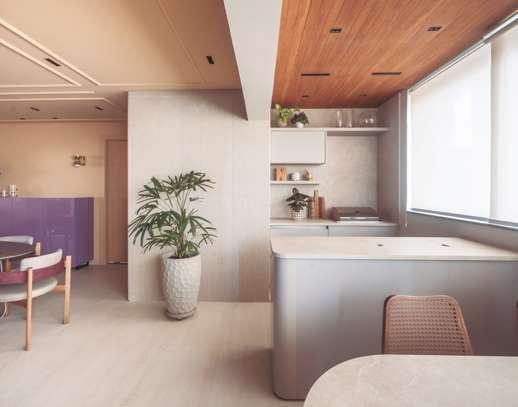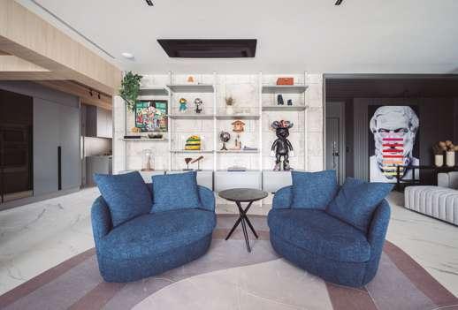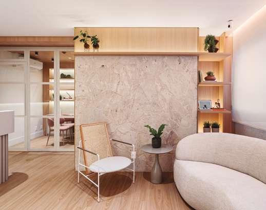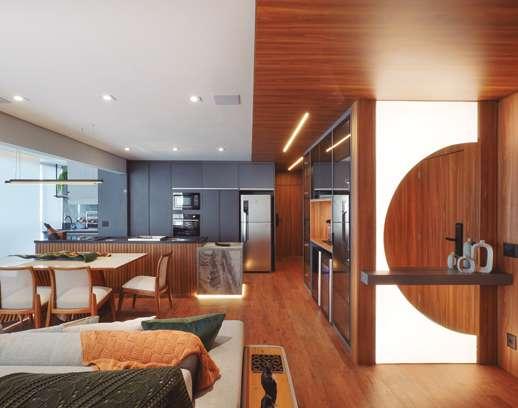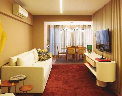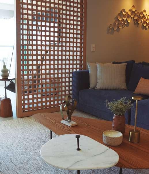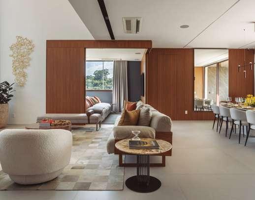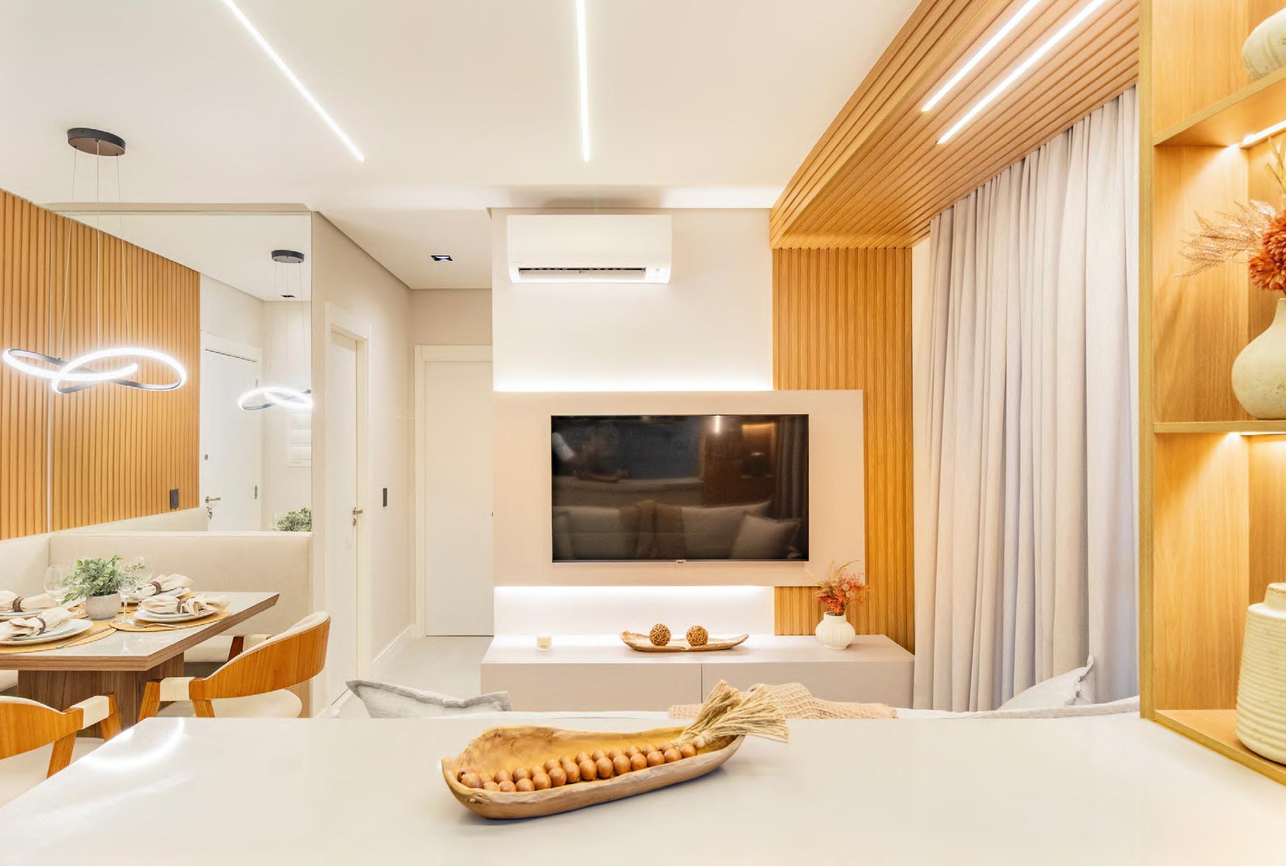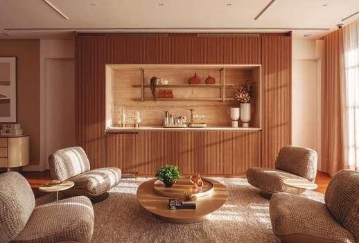Entre os principais destaques do projeto está o painel curvo amadeirado que organiza o living de forma fluida e escultural. A peça conduz o olhar naturalmente, e cria uma transição orgânica entre os ambientes. Outro elemento marcante é a adega transparente, que setoriza o espaço sem interromper a fluidez visual. A presença de obras de arte contemporâneas distribuídas por todo o apartamento traz cor, movimento e identidade à decoração, e estabelece um diálogo contínuo entre design e expressão pessoal.
