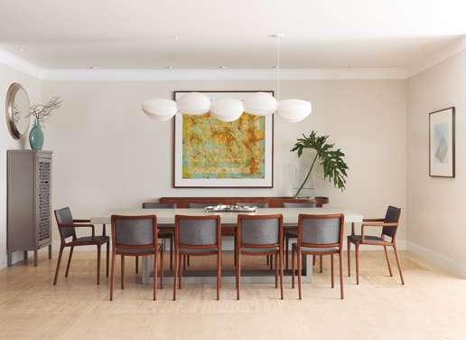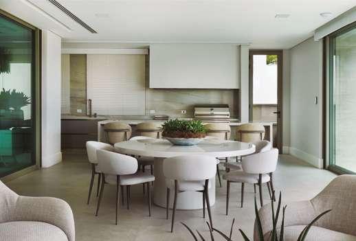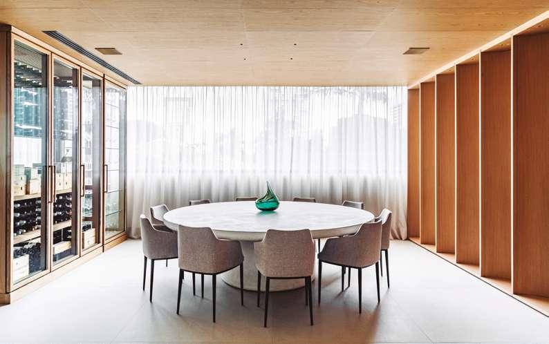 A sala de jantar acomoda até 10 pessoas em torno da mesa circular. A adega transparente setoriza o ambiente sem interromper a fluidez visual, enquanto o painel amadeirado com iluminação embutida adiciona profundidade e sofisticação ao espaço de•cor•ar