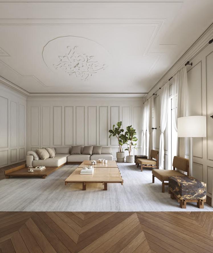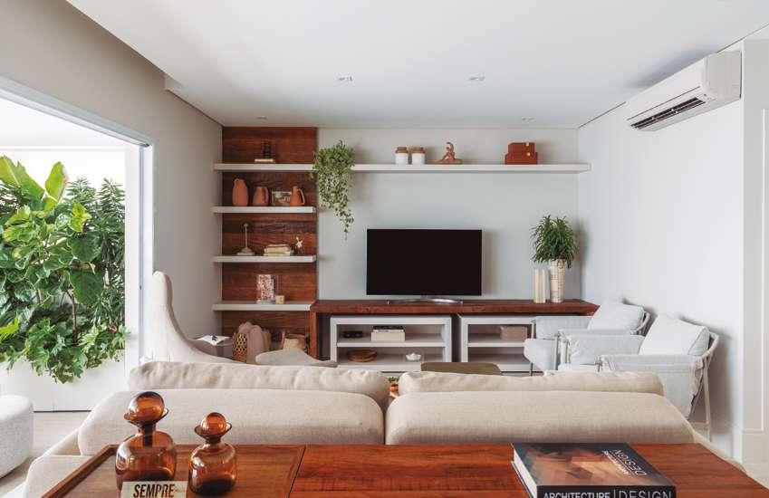 A base neutra em tons de off-white, cinza quente e madeira natural estabelece um pano de fundo sereno, carregado de elegância, pontuado por toques de cor que