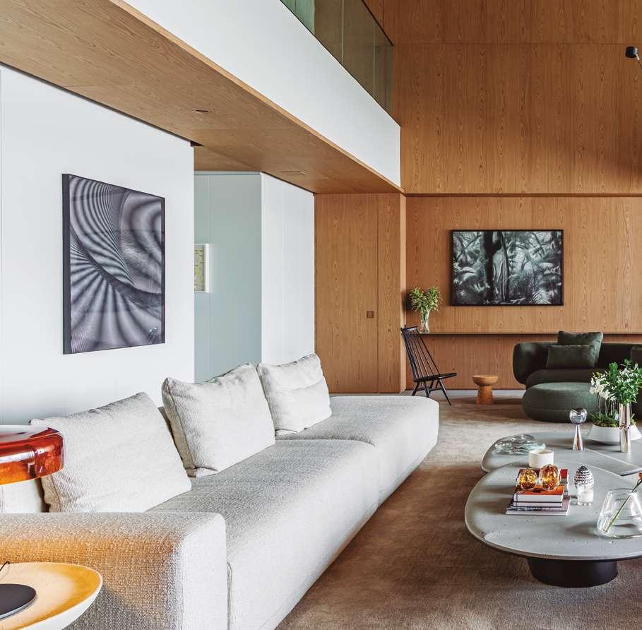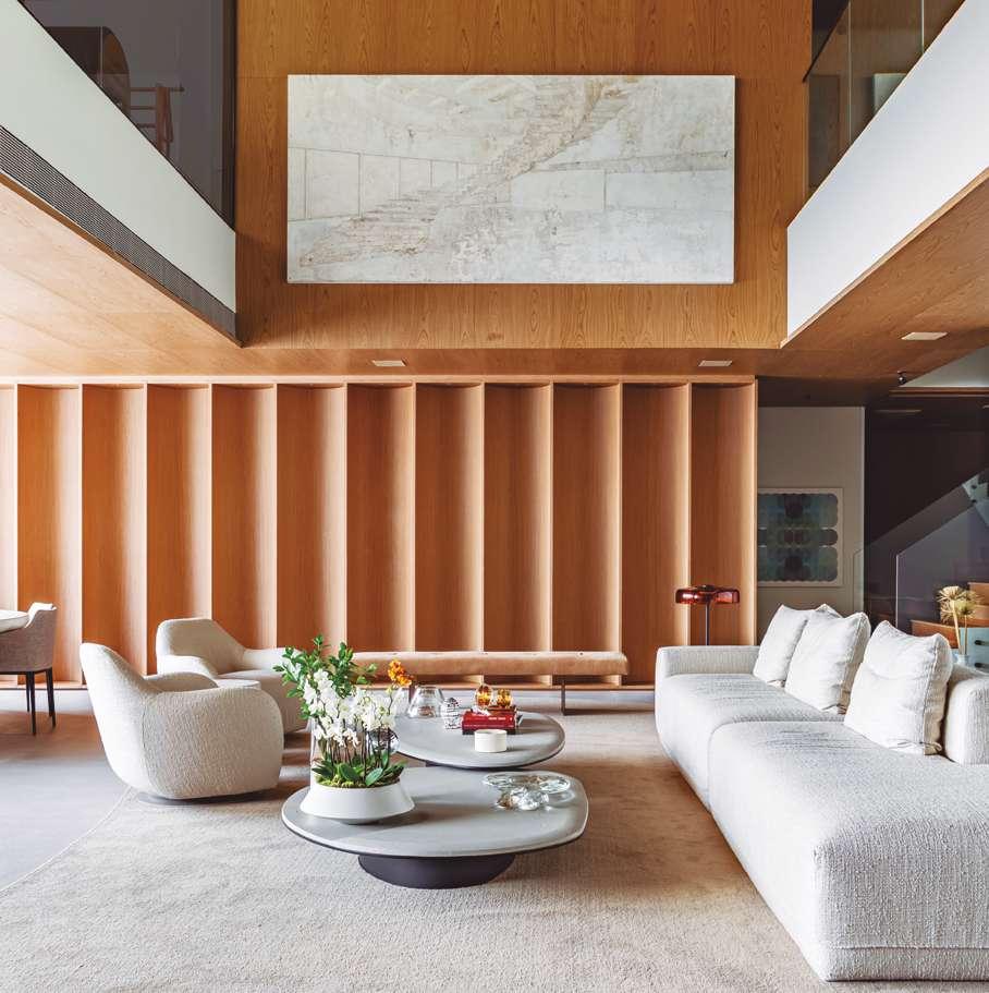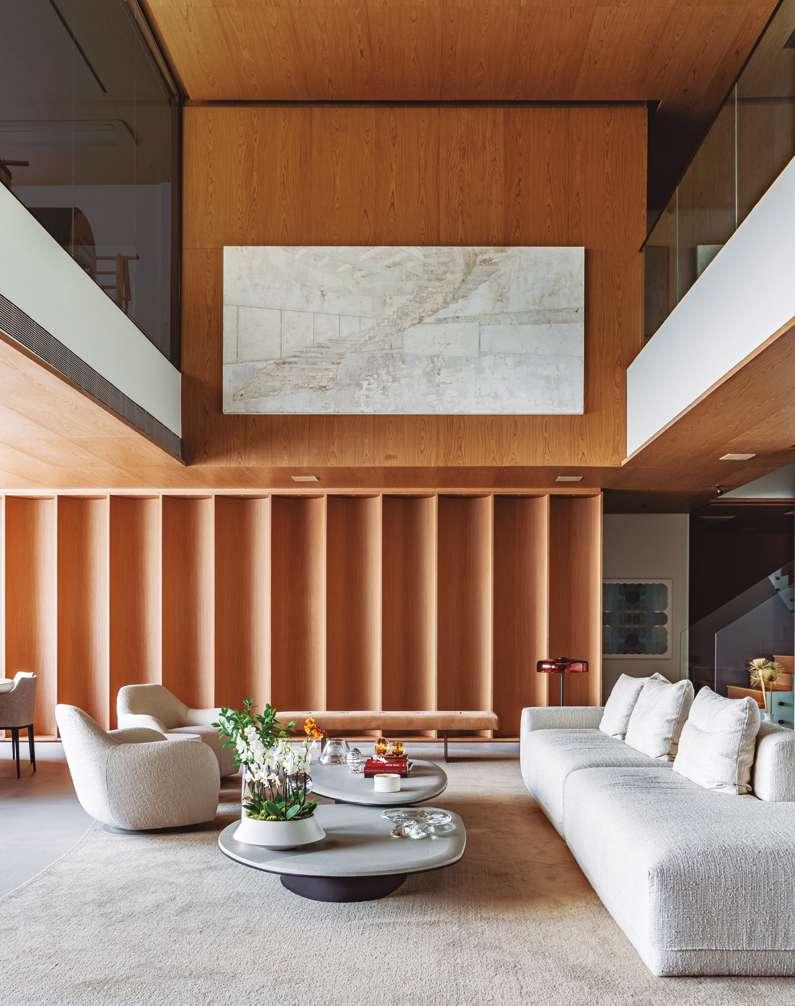 O living de pé-direito duplo destaca o painel curvo como elemento escultural que organiza os ambientes de forma fluida. O mobiliário em tons neutros dialoga harmoniosamente com a madeira natural, enquanto a arte contemporânea posicionada na parede superior ancora visualmente o espaço vertical