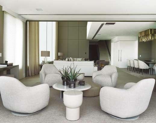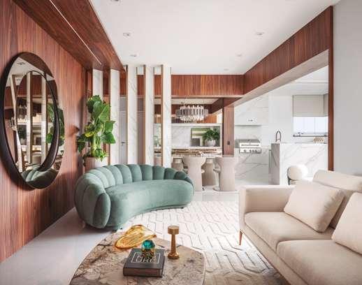 A amplitude do living integrado revela a conexão fluida entre os setores sociais através do painel curvo amadeirado, que conduz o olhar naturalmente do estar principal com mobiliário neutro até a área com sofá verde e evidencia a transição orgânica entre ambientes
