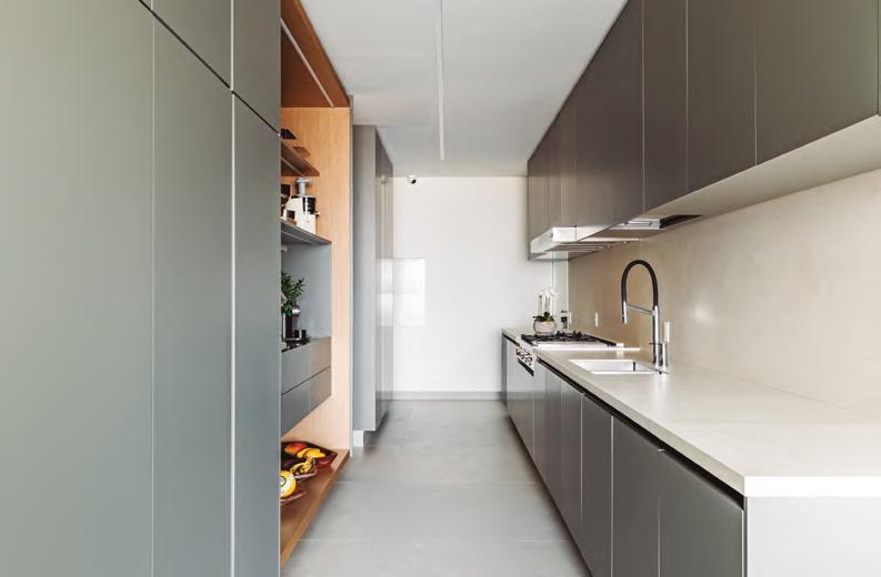 A cozinha em layout corredor apresenta marcenaria cinza com acabamento fosco e bancadas em superfície branca. O nicho em madeira natural à esquerda abriga utensílios e pequenos eletrodomésticos, criando contraste visual com as linhas minimalistas do ambiente