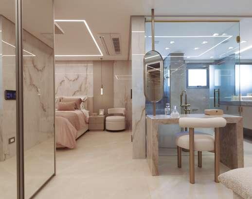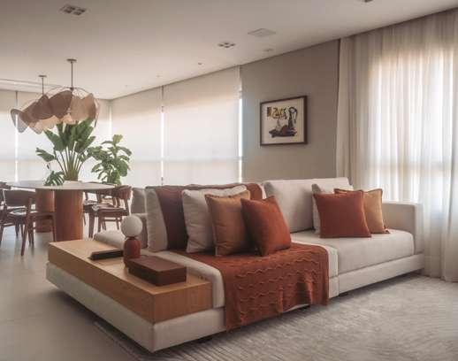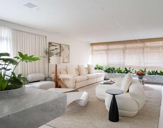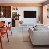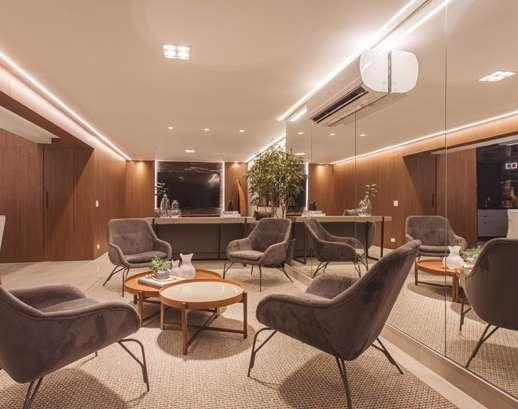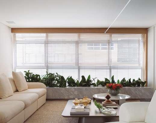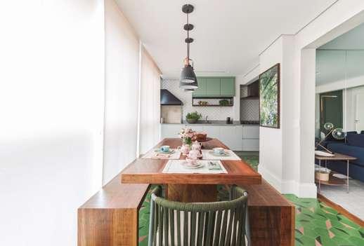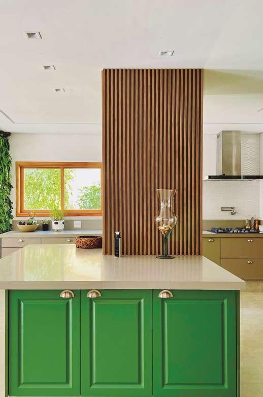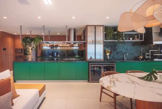 conferem vida e movimento ao projeto. O verde, presente em elementos decorativos e detalhes estratégicos, é o grande protagonista dessa narrativa cromática. A combinação reforça a sensação de amplitude e cria uma conexão sutil com a natureza sem comprometer a sofisticação do conjunto.