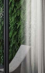 O sofá modular EOS da Artefacto, em verde musgo, traz frescor e personalidade ao estar secundário. O painel contínuo em madeira natural cria um pano de fundo sereno, valorizado pela fotografia botânica em preto e branco que reforça o diálogo entre design e expressão artística