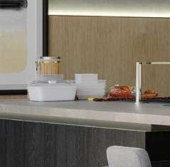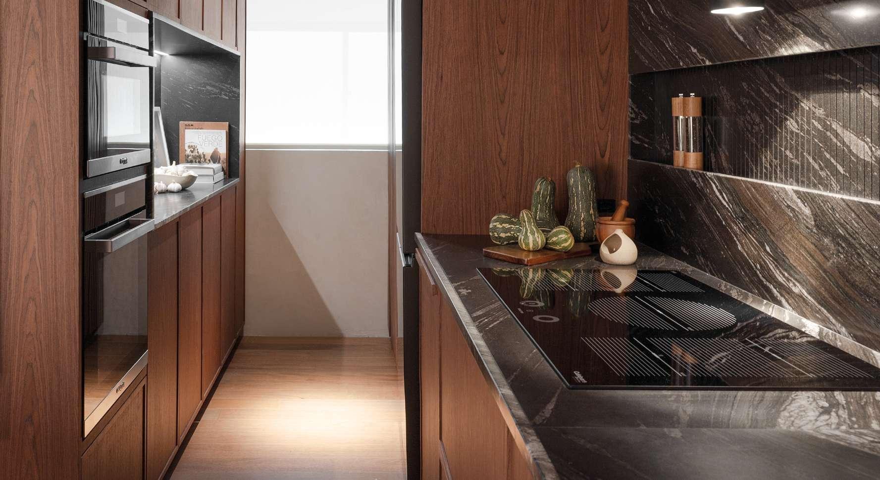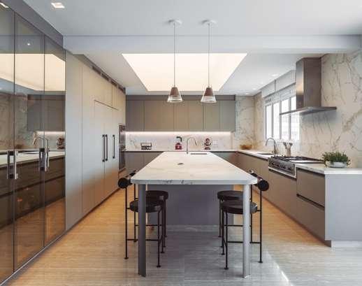 O painel retrátil revela a churrasqueira embutida e transforma a ilha em área gourmet completa. A solução versátil integra cozinha e convivência com acabamentos sofisticados, metal escovado e madeira
