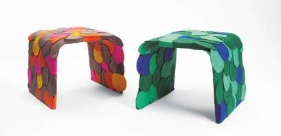 A coleção Escama, de Sofia Venetucci em parceria com a Virô, transforma materiais reaproveitados em design inovador. Bancos com estrutura de metal são revestidos por círculos de feltro reciclado que criam uma superfície tridimensional que remete à sobreposição orgânica de escamas.