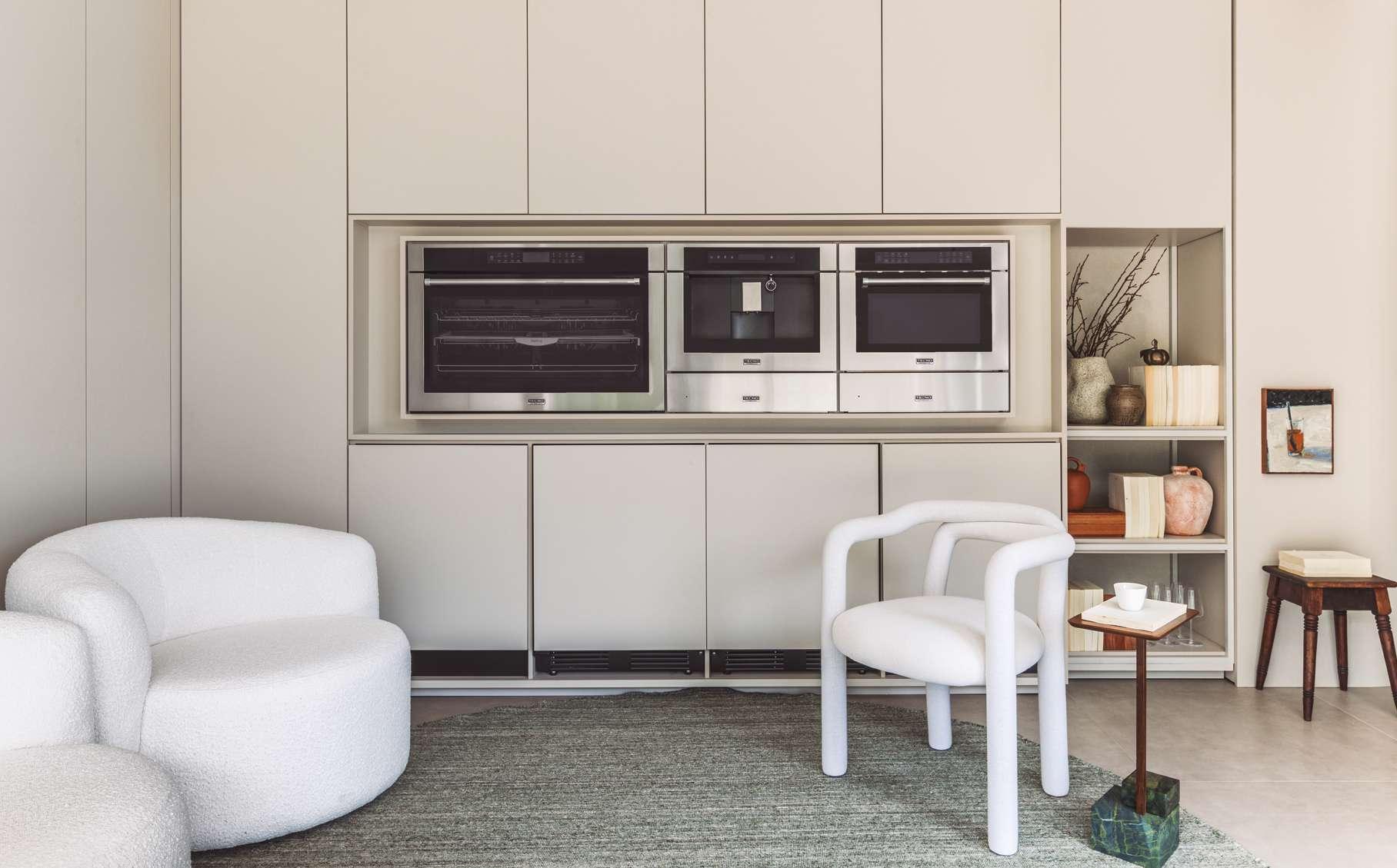 O nicho iluminado em madeira natural organiza a área de café com eletrodomésticos embutidos e prateleiras suspensas. A combinação entre madeira e laca cinza fosca nos armários cria uma composição equilibrada, com bancada de apoio que facilita o uso cotidiano