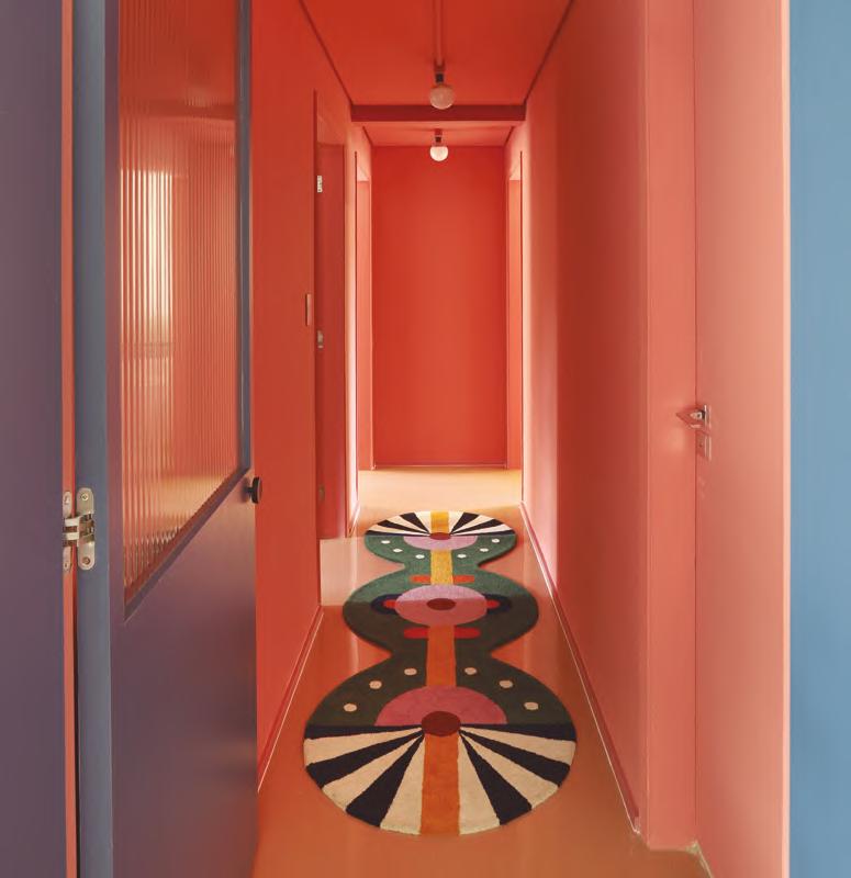 O corredor de acesso aos quartos surpreende com um color block em tons de rosa, enquanto o piso exibe um tapete geométrico colorido, assinado pelo Studio Massa
