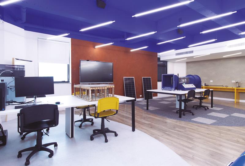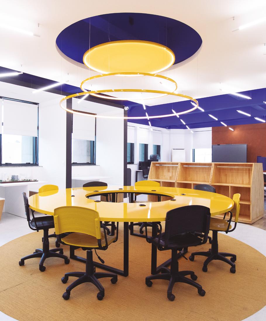 O conceito parte de um elemento central: o sol. Um grande círculo iluminado no teto, sobre uma mesa circular, conecta três áreas distintas do espaço, a de experimentação, a de estudos técnicos e tecnológicos e a de produção manual. “O sol simboliza a energia da criação. Ele nasce no centro e se expande, interligando todos os ambientes. A ideia é que o aluno esteja sempre sob essa luz, que representa conhecimento e inspiração”, explica Vasconcellos.