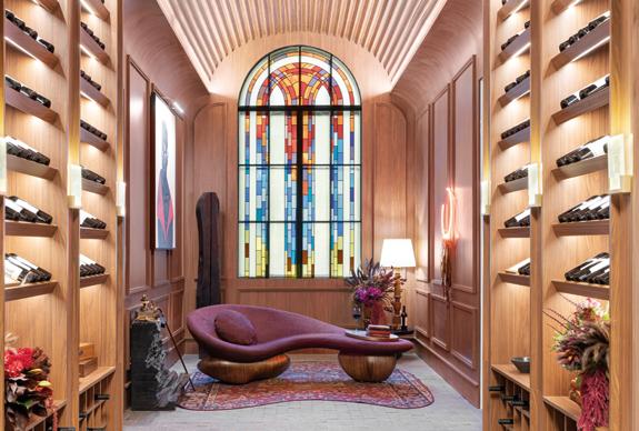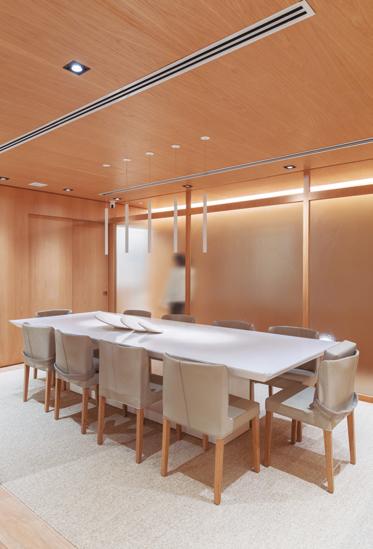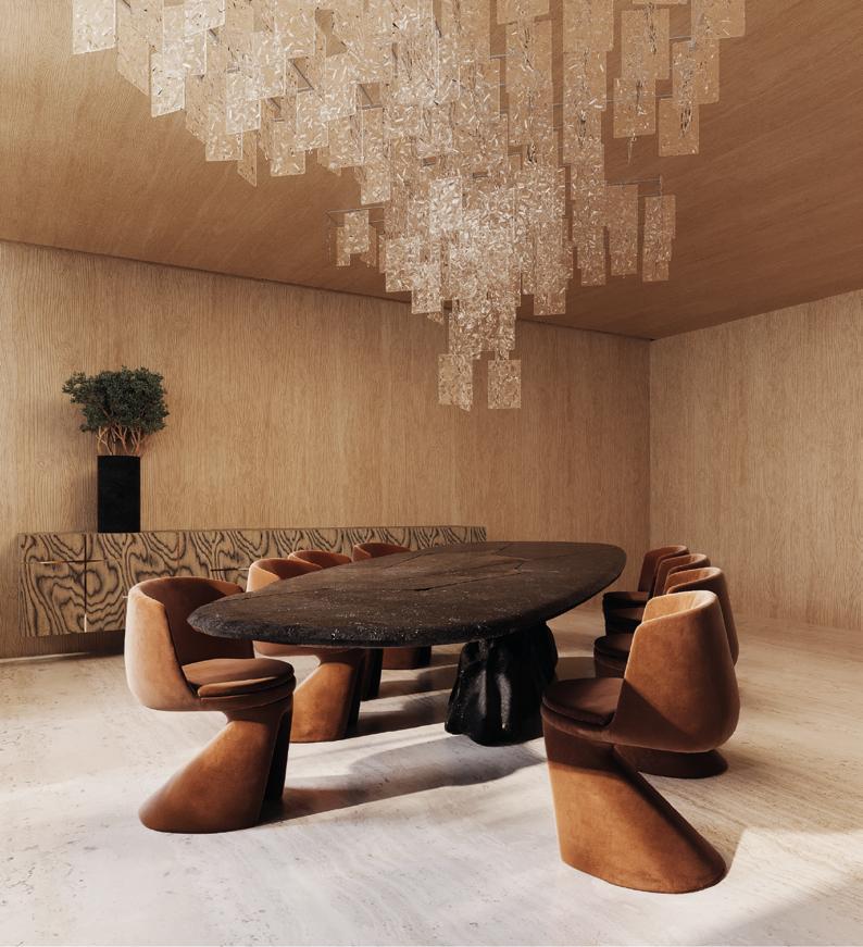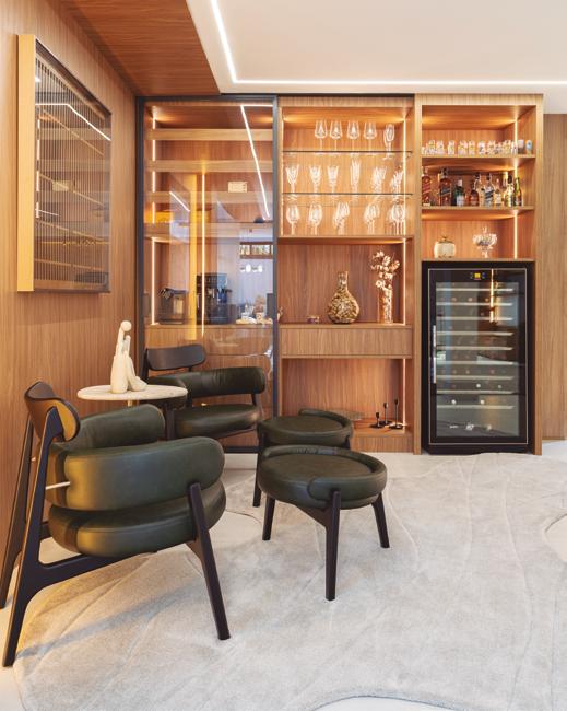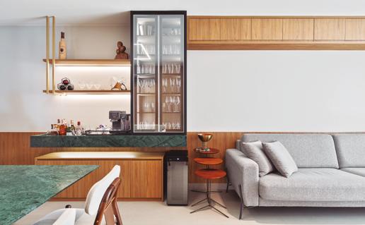 espaço surpreendesse e, ao mesmo tempo, acolhesse. Essa cristaleira faz isso desde o primeiro olhar”, pontua o arquiteto. A escolha dos materiais foi fundamental para trazer profundidade e identidade ao projeto. A base é quente e envolvente, madeiras naturais em tons médios aparecem em contraste com o toque texturizado do corte rockface nas pedras. A estrela da paleta, no entanto, é o intenso e sofisticado verde Guatemala, que aparece como protagonista na mesa de jantar e no bar, criando pontos de interesse visual que também expressam a personalidade dos moradores.