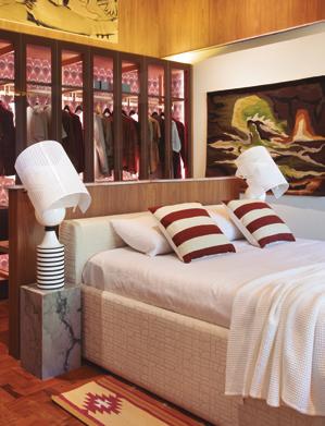 Já o quarto do casal se transforma em um refúgio pessoal, onde o conforto se alia à organização. Um dos destaques do ambiente é a penteadeira com espelho estruturado em metalon, ao lado da cama, peça que une delicadeza, funcionalidade e aproveitamento de espaço