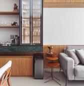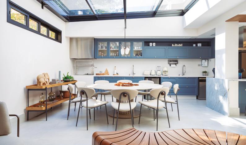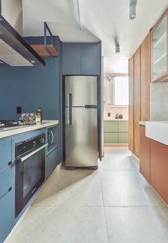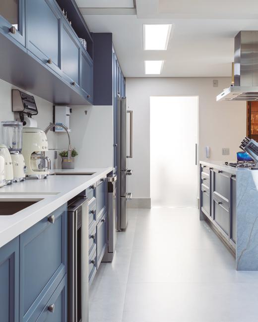 A cozinha é o grande xodó da família. Com inspiração provençal, recebeu um tom azul suave aliado à praticidade da bancada em lâmina sinterizada, resultando em um ambiente charmoso e funcional. Entre os ambientes sociais, merece destaque a adega em madeira, desenhada para armazenar vinhos, cristais e garrafas especiais, incluindo ainda uma adega climatizada. Esse espaço se tornou ponto de encontro em reuniões e celebrações.