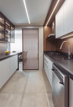 A cozinha fechada por muxarabi mantém conexão visual com o living através da elegante divisória vazada em madeira. O porcelanato Superquadra Concreto garante continuidade visual entre os ambientes