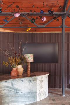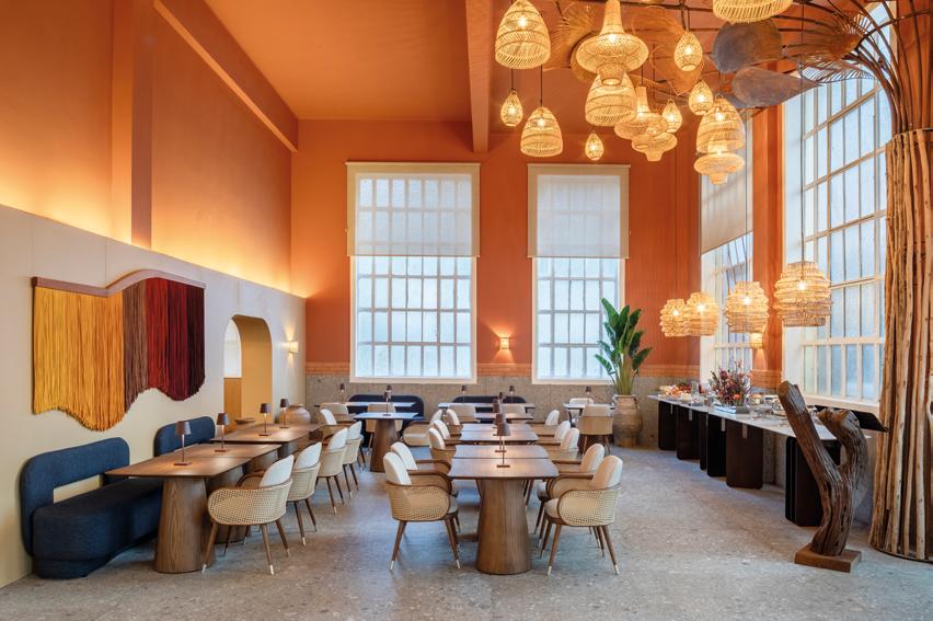 Com 260m², o Restaurante Casa Buriti integra gastronomia, design e natureza em um espaço que valoriza a arquitetura biofílica e a sustentabilidade, promovendo o reuso e a circularidade em todas as fases do projeto. A paleta de tons terrosos, terracota, azulmarinho e verde cria um ambiente conectado com o meio ambiente, complementado por materiais naturais como madeira, fibras vegetais e revestimentos de textura orgânica. A distribuição dos espaços prioriza a fluidez, convidando ao convívio e à contemplação, enquanto detalhes como peças artesanais e objetos handmade enriquecem o conceito de reencantar o cotidiano com beleza. A marcenaria, assinada pela Evviva, tem como destaque o lançamento da cor Cerrado, que traz leveza e sofisticação ao ambiente, e o móvel Leggera com portas de vidro, que traduz fluidez, transparência e versatilidade.