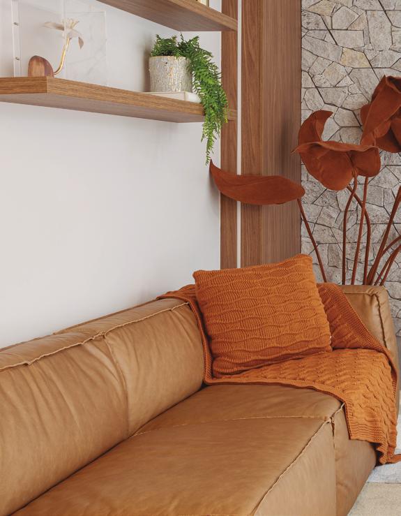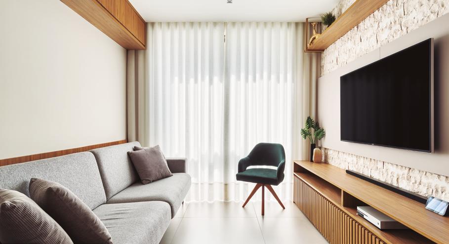 A sala de estar reflete esse equilíbrio: o painel da TV, que evita soluções óbvias, combina pedra natural e iluminação planejada para criar uma ambiência confortável e elegante, que funciona tanto para o descanso quanto para receber