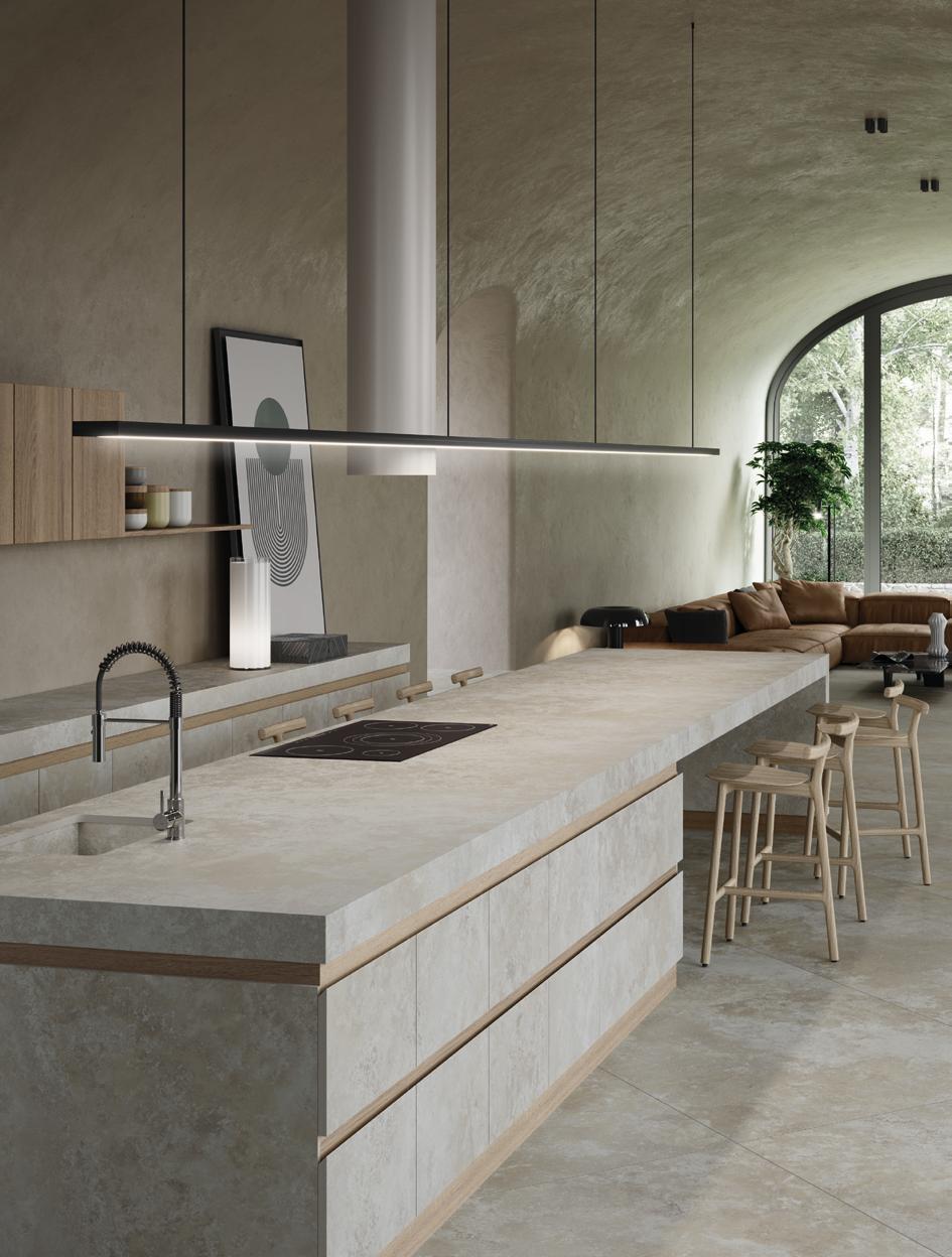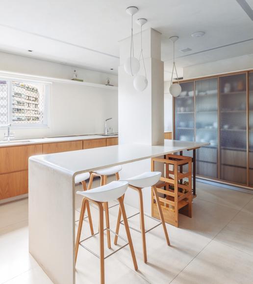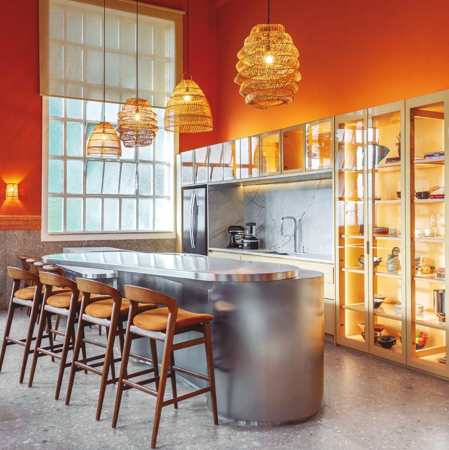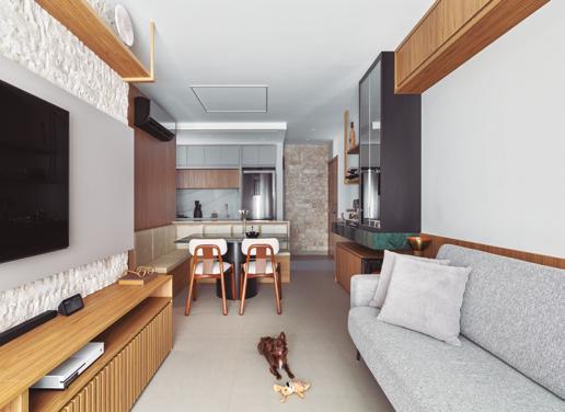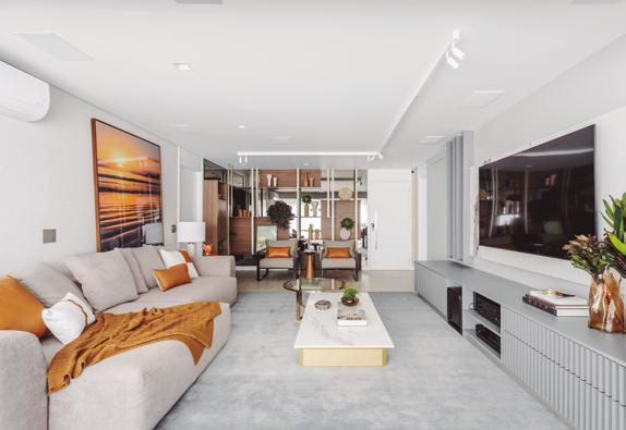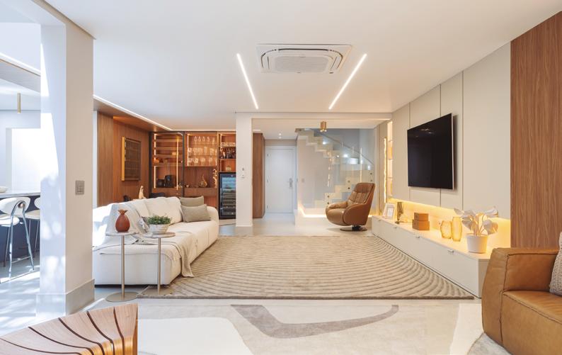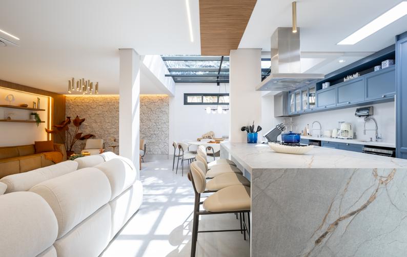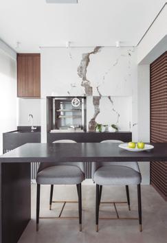transformar um espaço compacto em um ambiente fluido e sofisticado, sem perder funcionalidade. Tudo tinha que ter propósito”, explica Diego. O espaço foi reorganizado com marcenaria estratégica, soluções de armazenamento ocultas e ambientes integrados com transições suaves. A cozinha americana tornou-se protagonista: além de prática, ela marca visualmente o projeto com a bancada esculpida em quartzito Apolo, que molda armários e define o volume central da casa. Na entrada, uma cristaleira com iluminação automática e espelho prata fumê cria um ponto focal. “Queríamos que cada
