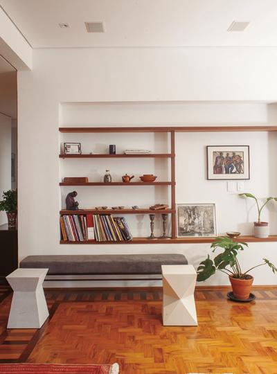 Detalhes que contam histórias: o retrofit respeitou a essência do espaço, valorizando o piso original de madeira e inserindo uma estante com nichos abertos que acolhe livros, obras de arte e objetos afetivos da moradora