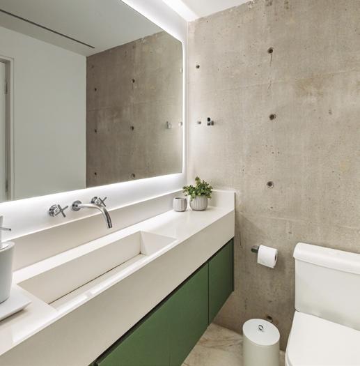 Respeitando a preferência do cliente pelo verde, os arquitetos preservaram o armário já existente em Verde Floresta e trabalharam toda a paleta de cores a partir dele. Destaque para o misturador de parede Duna Clássica Deca, fornecido pela Casa Mimosa Conceito
