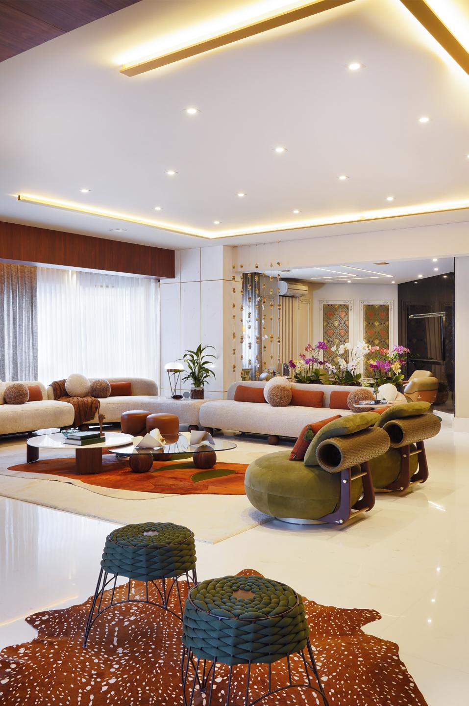 O sofá e os puffs, desenhados pelo próprio Studio Più em parceria com a CASA4 DECOR, completam a composição do living com exclusividade