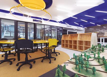 À esquerda do sol central, a maquetaria mantém viva a tradição manual da arquitetura com bancadas altas, ferramentas diversas e armários de madeira especialmente projetados para armazenar maquetes. O piso de pneus reciclados oferece conforto acústico e sustentabilidade, enquanto o teto azul vibrante conecta este espaço ao conceito solar que unifica todo o laboratório