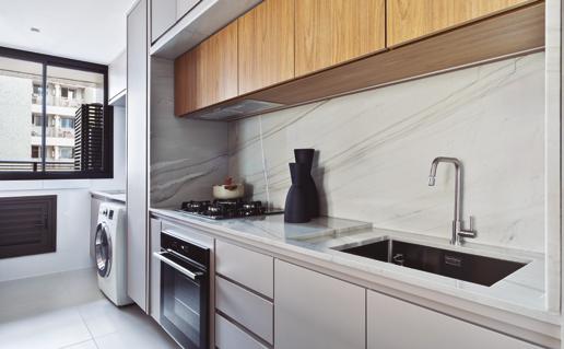 A cozinha se destaca pela bancada esculpida em quartzito Apolo com veios naturais, que se harmoniza com os armários superiores em madeira clara e gabinetes inferiores em tons neutros. O ambiente integra eletrodomésticos embutidos e soluções de armazenamento estratégicas, com área de serviço que otimiza a funcionalidade do espaço compacto