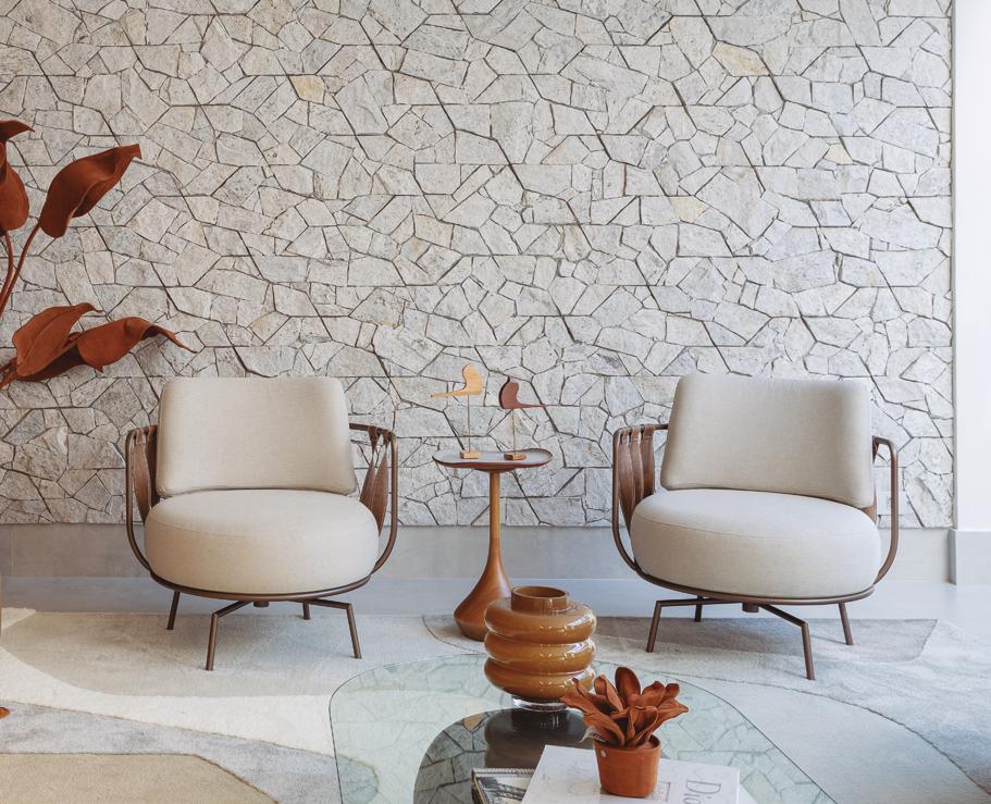 No living, a parede de destaque, revestida com mosaico de pedra natural em padrão irregular da Santa Bárbara Acabamentos, cria um ponto focal marcante que dialoga com a paleta terrosa do mobiliário fornecido pela Hindi Móveis
