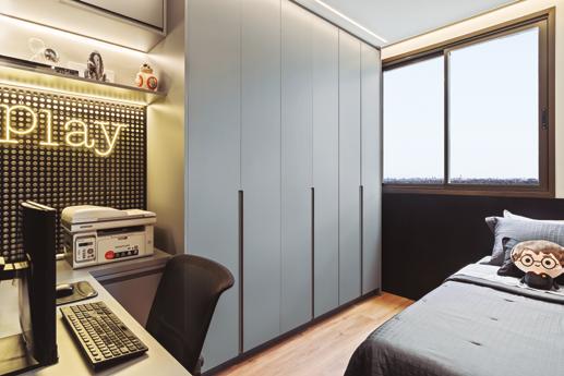 Na área íntima, cada quarto carrega uma narrativa própria. O quarto do filho foi pensado para contemplar diferentes usos: estudar, jogar, descansar. Com armários cinza e uma paleta sóbria, o ambiente aposta em funcionalidade, sem perder identidade.