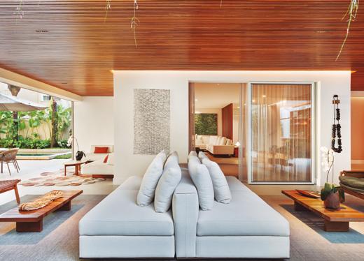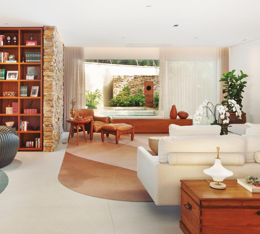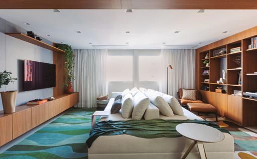 Para setorizar a sala em dois ambientes, o sofá-ilha separa o estar da área de descanso. Com foco na integração e na circulação fluida, as amplas janelas favorecem a circulação de luz natural, enquanto o tapete em verde, azul e tons terrosos traz dinamismo e cor ao ambiente revestido em freijó