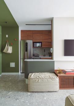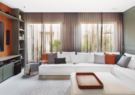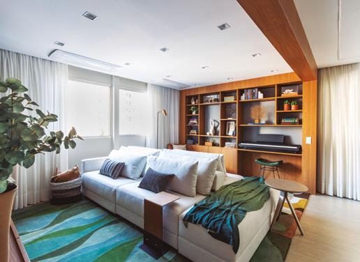em tom castanho aquece o décor. Durante a obra, uma viga estrutural foi transformada em pórtico e revestida com a mesma marcenaria planejada, que garantiu unidade estética. O porcelanato em grandes formatos reforça a sensação de amplitude, enquanto móveis soltos e multifuncionais, que foram desenhados de acordo com as necessidades dos moradores, se tornaram protagonistas da ambientação. A arquiteta dedicou atenção especial a duas paixões da família: música e literatura. Uma estante generosa abriga livros, objetos e um teclado retrátil, ao lado de um canto de leitura que recebe luz natural e é iluminado por LED em tons acolhedores.