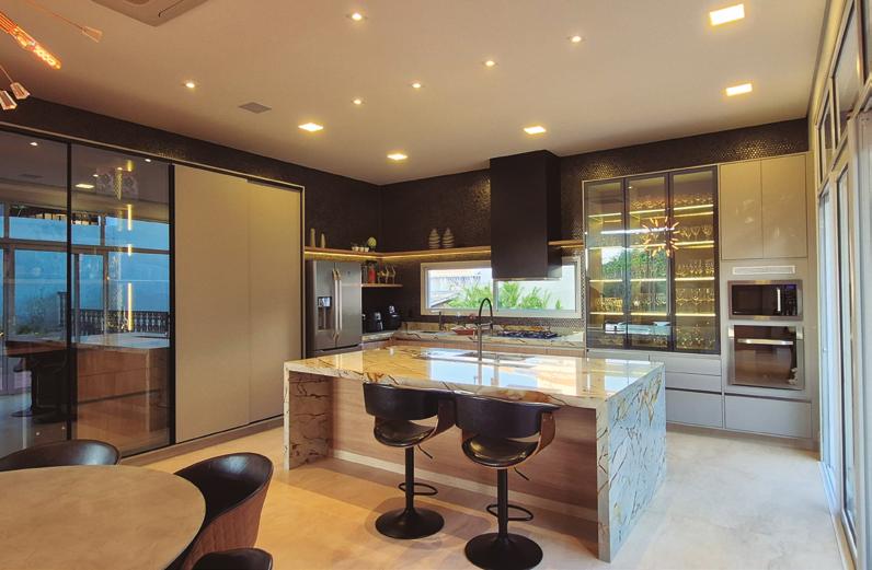 Com cristaleira iluminada, adega/bar funcional e marcenaria sob medida, a cozinha reflete o cuidado com cada detalhe, aliando elegância e praticidade
