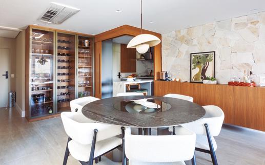 O granito rústico reveste a parede onde está o buffet, marcando um contraste elegante no espaço da sala de jantar. Na outra lateral, a cristaleira e adega, ambos com portas de vidro reflecta, reúne a coleção de vinhos, taças e os demais acessórios para esses momentos. A sala de jantar tem a mesa redonda como referencial para a distribuição de todo o ambiente