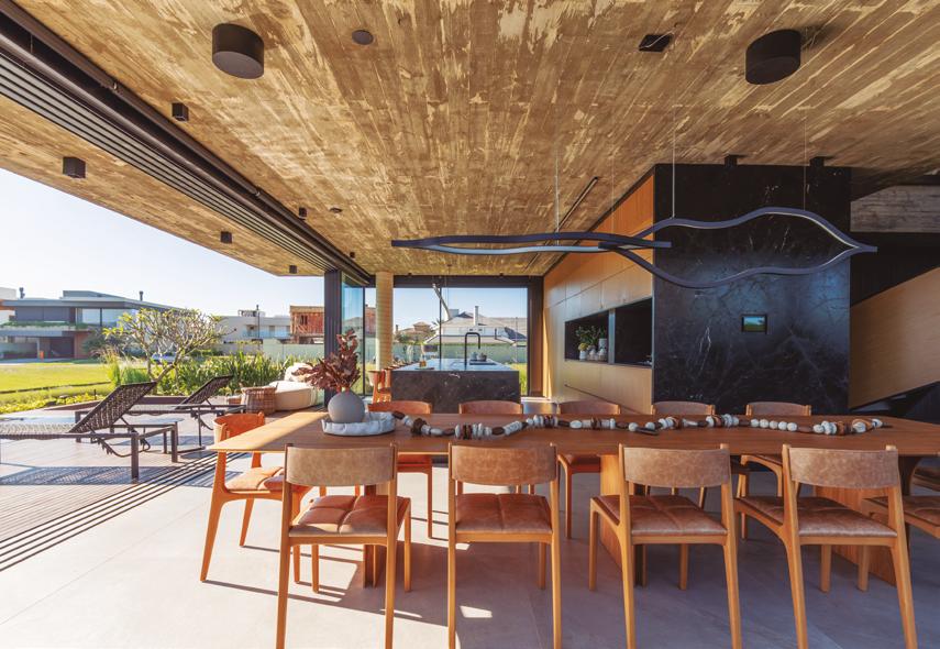 Com teto em madeira e pendentes de inspiração marroquina, o espaço gourmet exala conforto e descontração. A marcenaria em tons naturais e o piso em cimento queimado reforçam a atmosfera serena, enquanto as amplas aberturas integram o ambiente à piscina e aos jardins