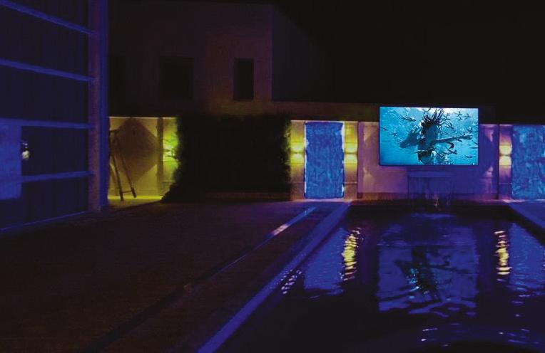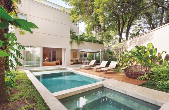 A reforma assinada por Emanuel Lorençon valoriza as vistas para o jardim e a piscina, que se integra ao paisagismo colorido. Com bordas em travertino romano e revestimento azul royal, o conjunto forma um refúgio de bem-estar aos pés da Serra do Japi