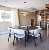 Na sala de jantar, a mesa redonda organiza o espaço, enquanto um buffet em freijó dialoga com a parede em granito rústico. Próxima, uma cristaleira com adega em vidro expõe a coleção de vinhos. A cozinha se integra ao ambiente por meio de portas de madeira embutidas, que podem ser fechadas quando se deseja maior privacidade. Quando abertas, revelam a ilha em Calacatta com veios cinza, que também serve como bancada de refeições. Por meio de soluções funcionais, Daniela Funari trouxe ao projeto leveza e elegância em equilíbrio. O apartamento foi modernizado, mas mantém viva a história de seus moradores.